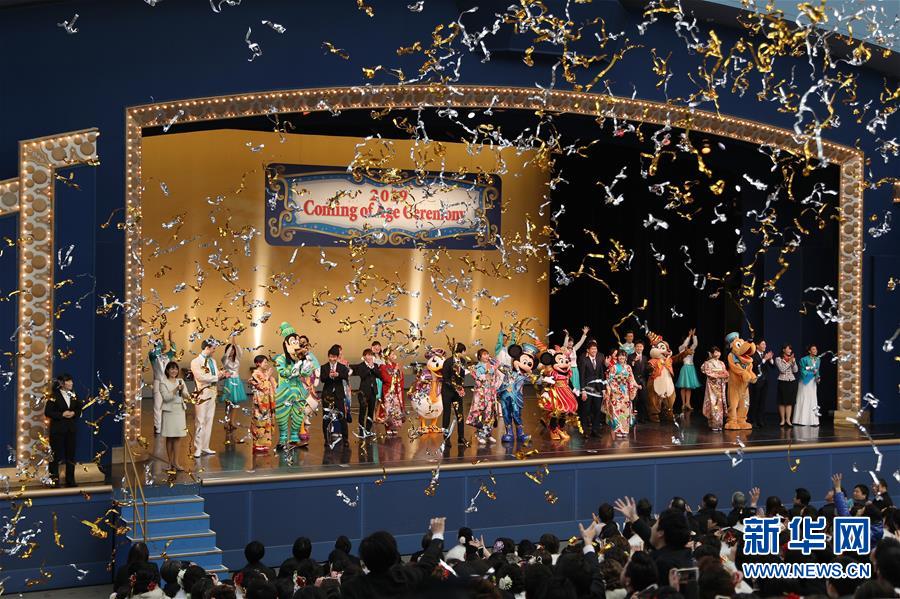 1月14日,在日本千葉縣的東京迪士尼樂園,迪士尼卡通人物與參加“成人禮”的年輕人共同慶祝。新華社記者杜瀟逸攝
