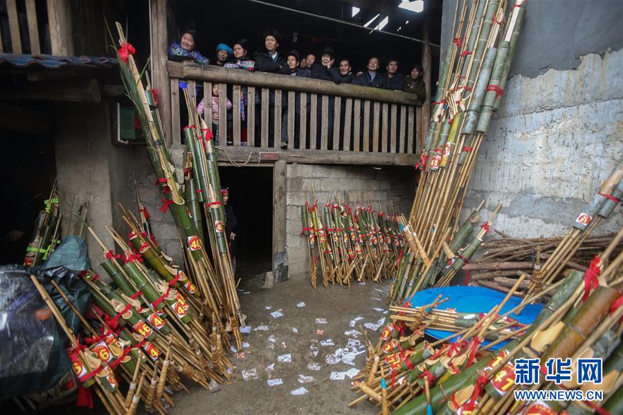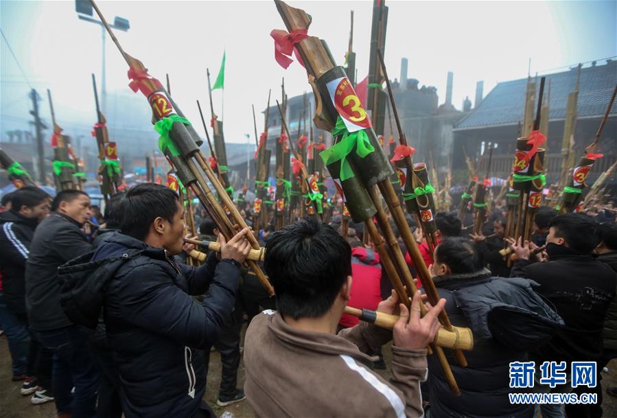 1月14日,人們?cè)趶V西融水苗族自治縣紅水鄉(xiāng)舉行的蘆笙節(jié)上賽蘆笙。