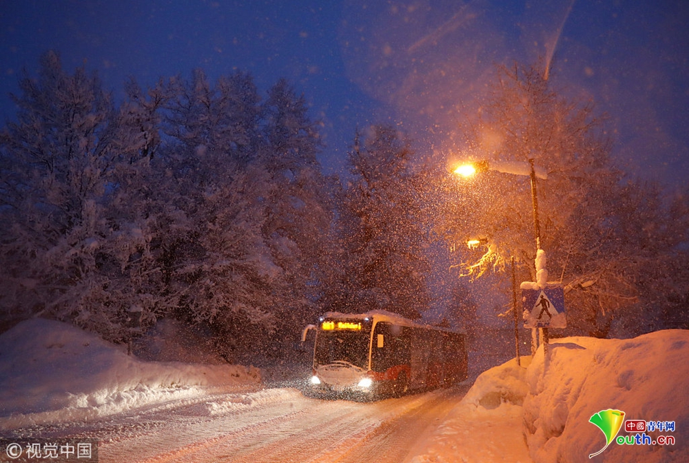 德國(guó)多地大雪紛飛 火車被困半路進(jìn)退不得