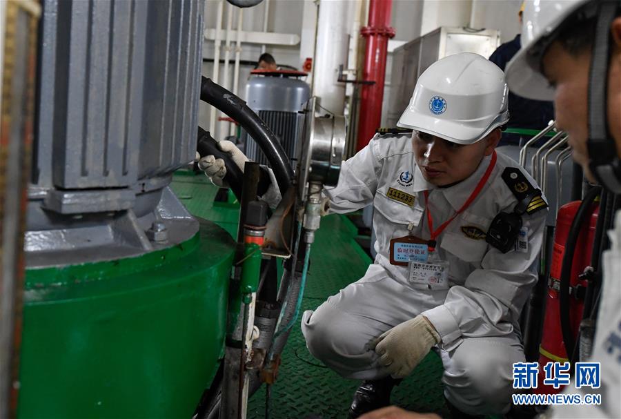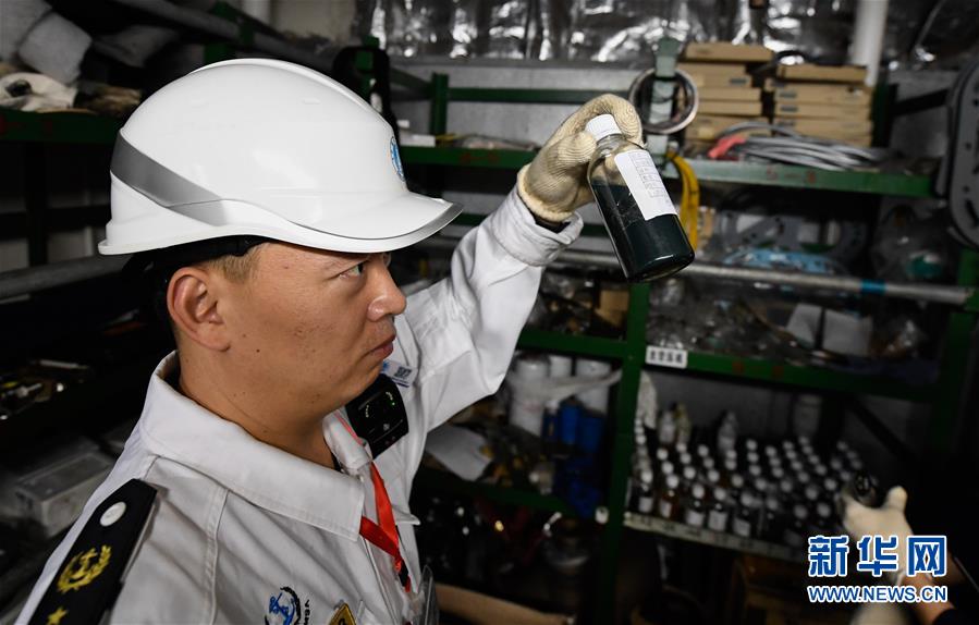 1月15日,海口海事局工作人員在粵海鐵4號客滾船上檢查油樣。新華社記者 楊冠宇 攝