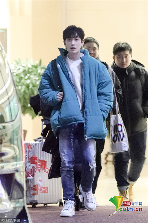 1月15日,北京,朱一龍現身機場。他穿綠色棉襖一路插兜保暖,搭配破洞褲潮范兒十足長腿搶鏡,打扮簡單毫無男神包袱,看鏡頭還一臉呆萌,但氣質仍然出眾。