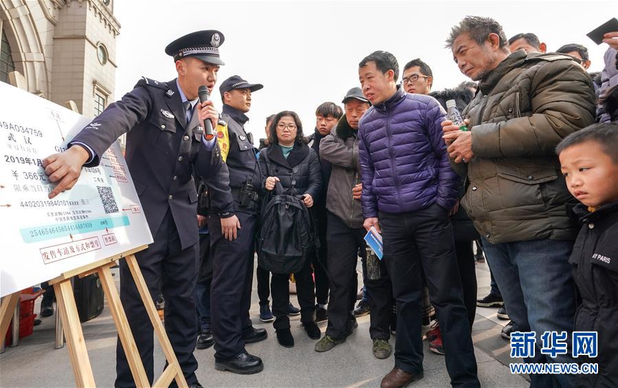 1月16日,民警講解真假火車票辨識方法。 當(dāng)日,武漢鐵路公安處在漢口火車站舉行警營開放日活動,讓旅客零距離接觸警務(wù)安全工作,營造良好的春運出行環(huán)境。 新華社記者程敏攝