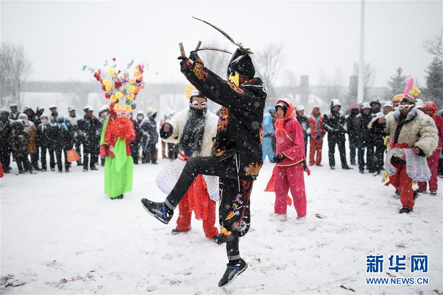 2月16日,社火隊(duì)演員在青海省大通回族土族自治縣文化廣場(chǎng)表演。新華社記者吳剛攝