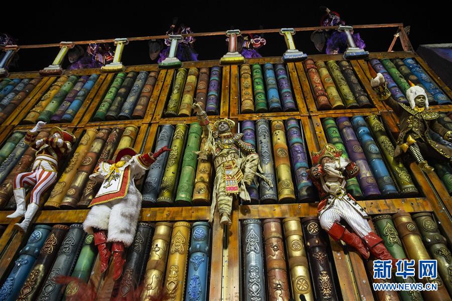 3月3日,在巴西里約熱內(nèi)盧,特級組桑巴舞校工作人員參加狂歡節(jié)游行。 3月3日晚,2019年里約熱內(nèi)盧狂歡節(jié)特級組桑巴舞校在桑巴大道開始花車巡游表演。 新華社記者李明攝