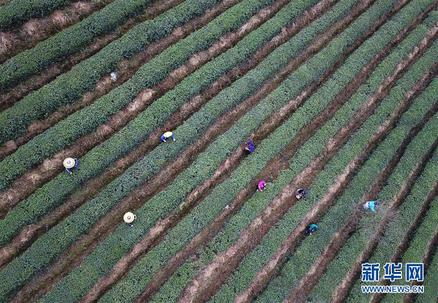 3月17日,采茶工在丹寨縣龍泉鎮(zhèn)馬寨村的茶園里采摘春茶(無人機(jī)拍攝)。新華社記者 楊文斌 攝