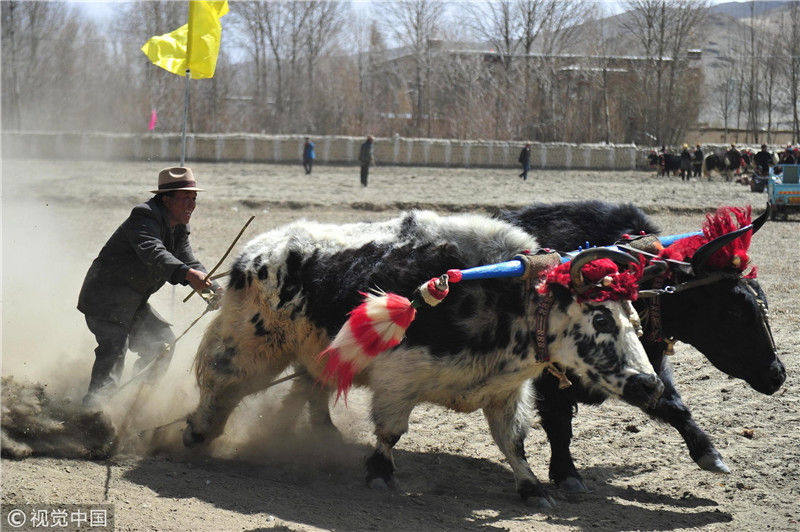 圖為白朗縣洛江鎮(zhèn)農(nóng)牧民進(jìn)行“賽?!被顒?dòng),只要農(nóng)牧民不從犁上掉下來,便可以獲得一把象征著勞動(dòng)致富的鐵鍬。