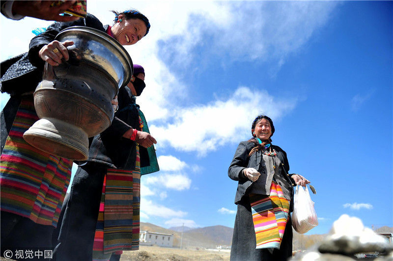 2019年3月16日,西藏各地迎來開耕節(jié)。位于年楚河畔的日喀則白朗縣被譽為“后藏糧倉”,當日,當地藏族農牧民將家里的耕牛裝扮一新,對農田進行開耕,大家齊聚青稞地,慶祝春播開始。圖為白朗縣洛江鎮(zhèn)民眾在青稞地里煨桑煙(一種祈福方式)、敬獻青稞酒,祈福新的一年風調雨順、五谷豐登。 江飛波(西藏分社)/中新社/視覺中國 編輯/陳進