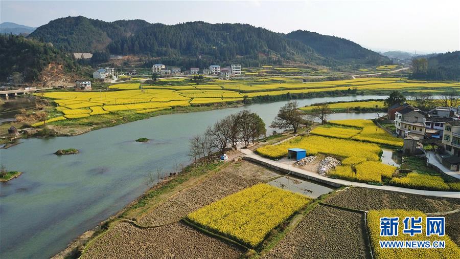 3月20日在貴州錦屏縣新化鄉(xiāng)拍攝的春景(無人機(jī)拍攝)。春分將至,貴州各地成片的油菜花漸次綻放,如同金色的地毯鋪上云貴高原。 新華社記者 歐東衢 攝
