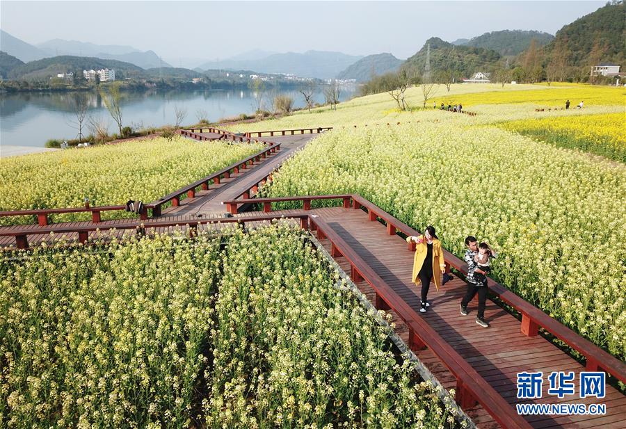 3月19日,游人在下涯鎮(zhèn)油菜花海中游玩(無人機拍攝)。近日,浙江省建德市下涯鎮(zhèn)油菜花盛開,吸引不少游客前來踏春。 新華社記者翁忻旸攝