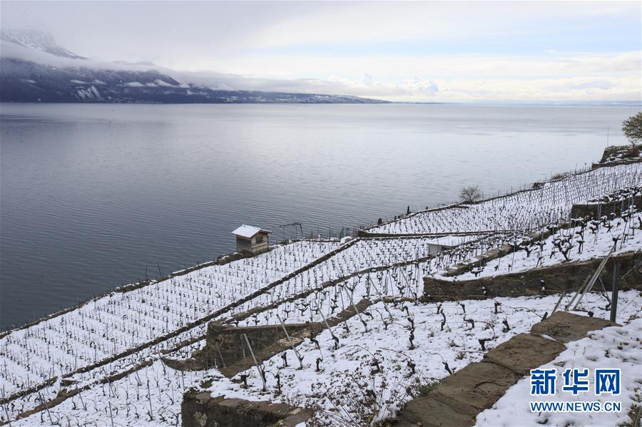 這是4月4日在瑞士西部拉沃地區(qū)拍攝的雪后梯田式葡萄園美景。