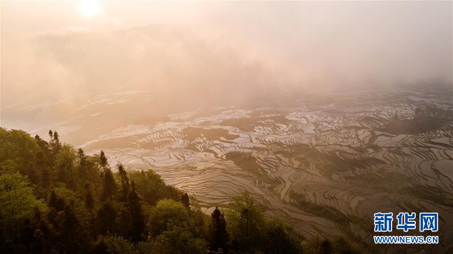 這是在云南省元陽縣拍攝的晨曦中的哈尼梯田美景(4月4日無人機(jī)拍攝)。哈尼梯田位于云南省哀牢山南部,以哈尼族為主的當(dāng)?shù)厝罕娗О倌陙砩幌⒃诖蟮厣稀暗窨獭背鲞@一農(nóng)耕文明奇觀。春日里,漫山的水稻梯田與云海、森林、村莊形成一幅美麗的畫卷,吸引眾多海內(nèi)外游客前來觀賞。新華社記者 胡超 攝