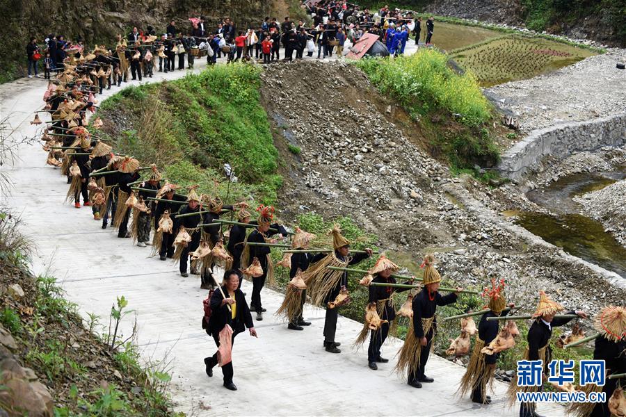 4月7日,苗族群眾挑著祭品走在祭“巫耶”儀式途中。4月6日至7日,在貴州省黔東南苗族侗族自治州劍河縣觀么鎮(zhèn)新民村和新合村,來自劍河縣和三穗縣的苗族同胞歡聚一堂,通過民族歌舞展演、非遺手工藝展示、千戶祭“巫耶”、跳蘆笙舞等形式,與來賓一起歡慶2019年高雍苗族“三月三”民俗文化節(jié)。 新華社記者 楊文斌 攝