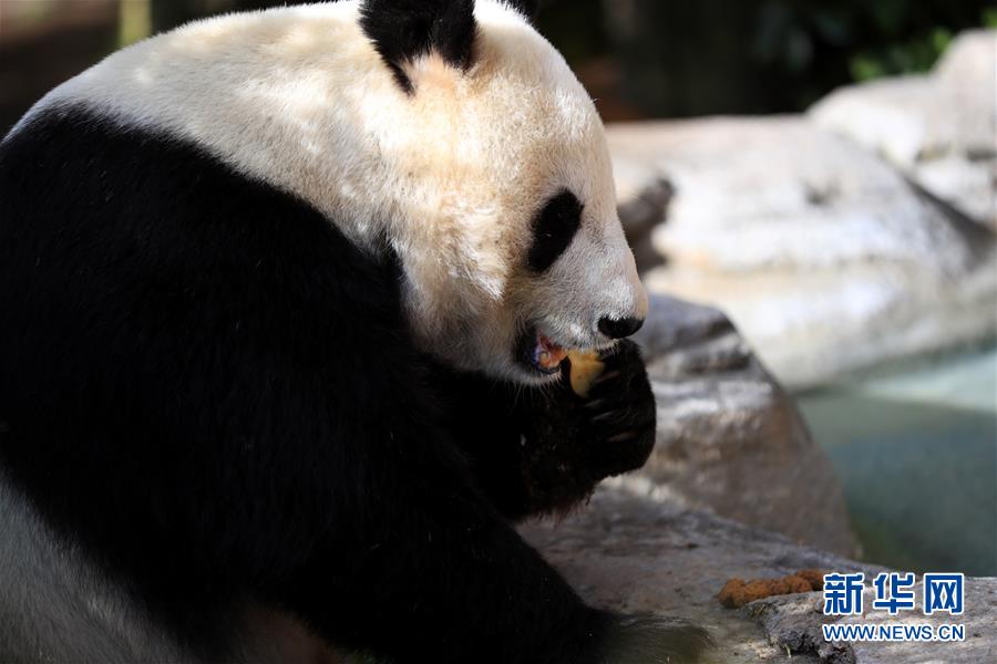 4月6日,在美國圣迭戈動物園熊貓館,大熊貓“白云”在吃水果。新華社記者李穎攝