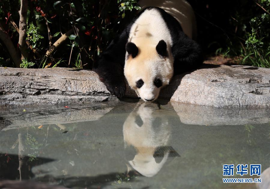 4月6日,在美國圣迭戈動物園熊貓館,大熊貓“白云”在喝水。新華社記者李穎攝