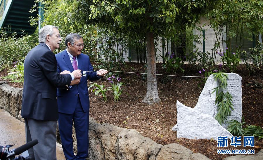 4月6日,在美國圣迭戈動物園,中國駐洛杉磯總領(lǐng)事張平(右)為“大熊貓保護項目”紀念碑揭幕。新華社記者李穎攝
