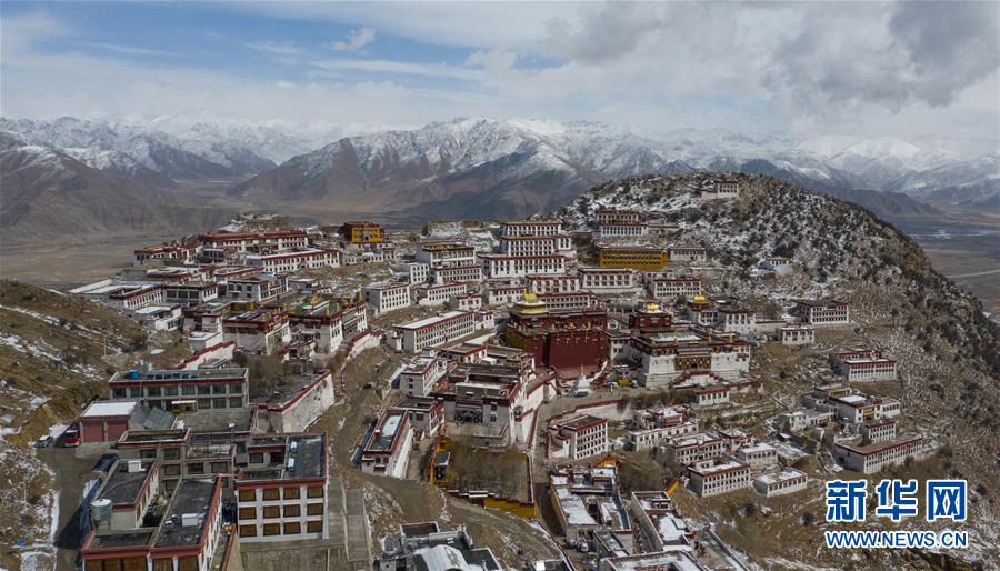 雪后的甘丹寺(4月8日無人機拍攝)。新華社記者普布扎西攝