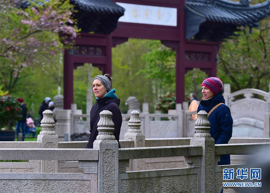 4月17日,在德國首都柏林,兩名游客在“得月園”內(nèi)參觀?!暗迷聢@”位于德國柏林東部的世界公園內(nèi),占地約2.7萬平方米,于1997年開工建造,2000年10月正式對外開放,自建成后以其獨特的中式園林魅力成為世界公園眾多不同風(fēng)格園林中一顆耀眼的明珠。 新華社記者單宇琦攝