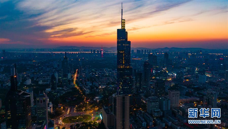這是4月17日無(wú)人機(jī)拍攝的南京紫峰大廈和城市夜景。 新華社記者 李博 攝