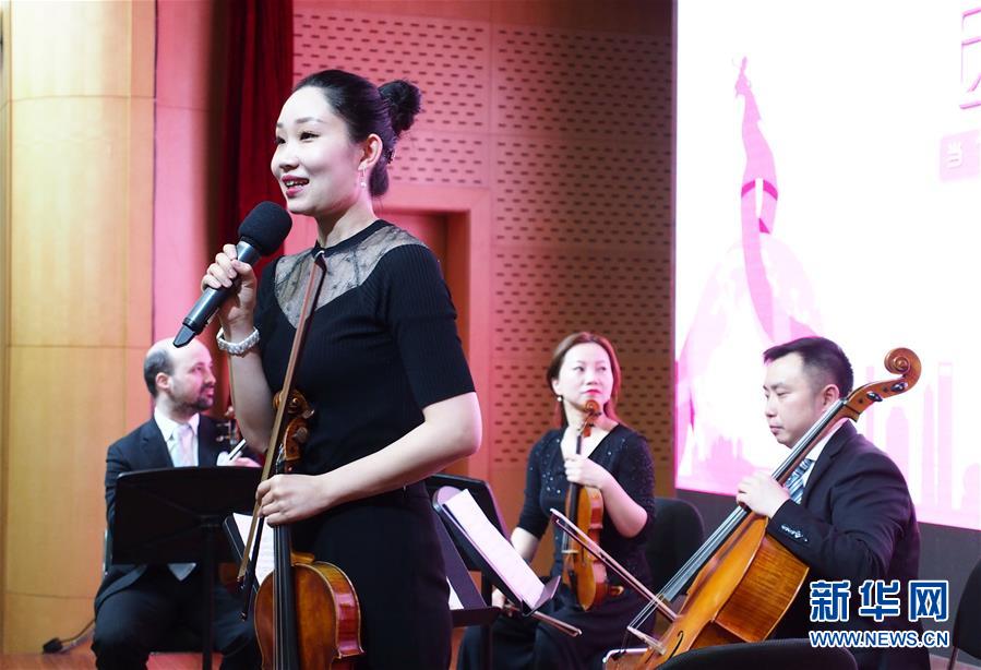 4月25日,上海交響樂團的中提琴手巴桐在演奏前介紹曲目。 當日,第一場“全城交響·上交為你而來”音樂會在復旦大學附屬腫瘤醫(yī)院報告廳奏響,為患者及醫(yī)護人員獻上一場專屬音樂會?!叭墙豁憽ど辖粸槟愣鴣怼笔巧虾=豁憳穲F2019年向全上海的機構及個人開放的公益演出項目。 新華社記者 任瓏 攝