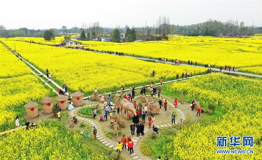 在四川都江堰市柳街鎮(zhèn)七里詩鄉(xiāng),游客在油菜花地里休閑游玩(3月16日無人機拍攝)。 新華社記者 江宏景 攝
