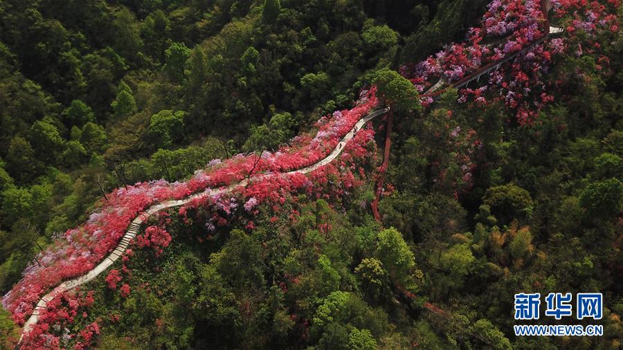 安徽省岳西縣天峽風景區(qū)內的杜鵑花競相綻放(4月12日無人機拍攝)。 新華社記者 張端 攝