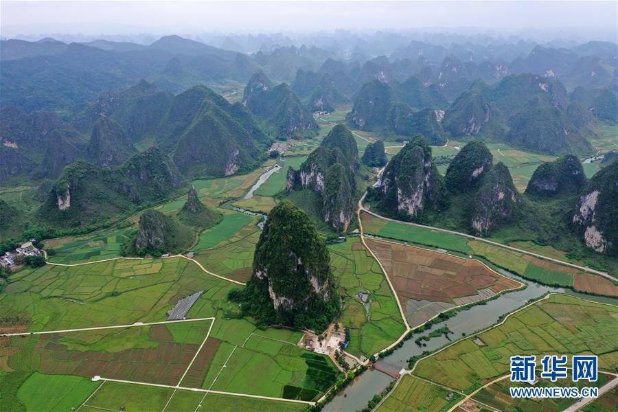 這是廣西靖西市新靖鎮(zhèn)境內的田園風光(4月16日無人機拍攝)。 新華社記者 陸波岸 攝