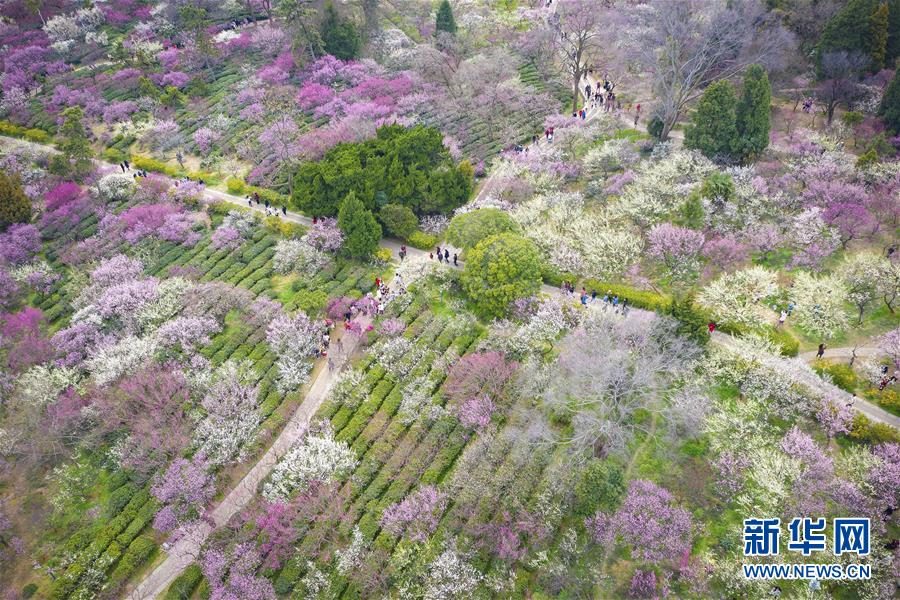 游客在江蘇南京梅花山賞花(3月8日無人機拍攝)。 新華社發(fā)(蘇陽 攝)