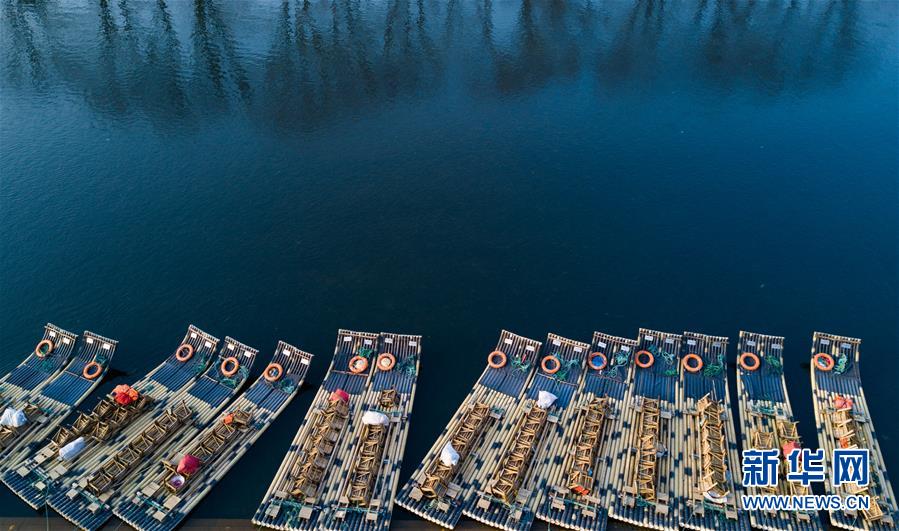 這是福建省武夷山風景名勝區(qū)九曲溪邊停靠的竹筏(3月11日無人機拍攝)。 新華社記者 宋為偉 攝