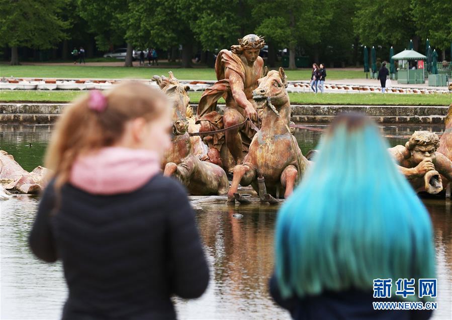4月25日,在法國巴黎近郊,兩個(gè)女孩在凡爾賽花園內(nèi)欣賞噴泉。新華社記者高靜攝