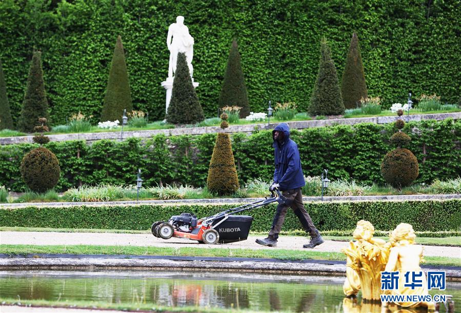 4月25日,在法國巴黎近郊,園丁在凡爾賽花園內割草。新華社記者高靜攝