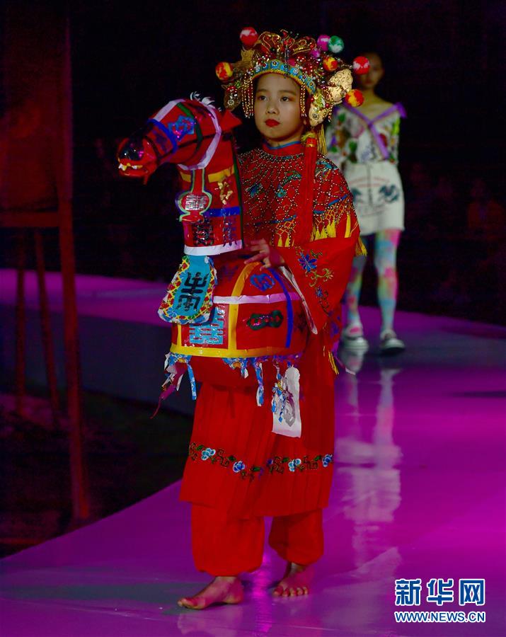 4月27日,小模特身穿民族服飾展示土樓當?shù)氐姆俏镔|(zhì)文化遺產(chǎn)竹馬戲。 當日,土樓光語國際時尚大秀在福建省南靖縣的土樓裕昌樓內(nèi)舉行。這場融匯文化、時尚與旅游元素的大秀,通過傳統(tǒng)與時尚的有機融合,展現(xiàn)南靖土樓及文化的魅力和風采。 新華社記者魏培全攝