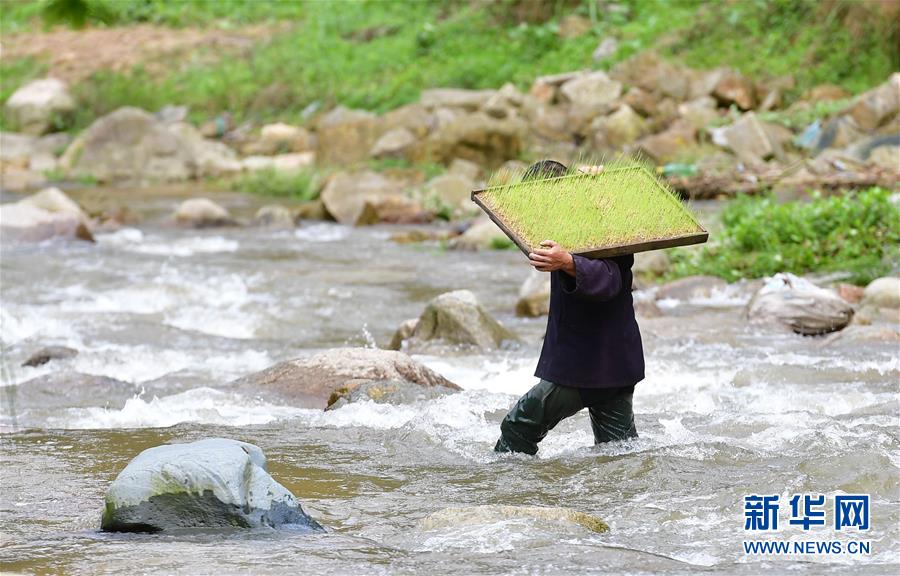 在黔桂烏英苗寨,村民扛著秧苗過河,準(zhǔn)備插秧(4月16日攝)。 新華社記者 黃孝邦 攝