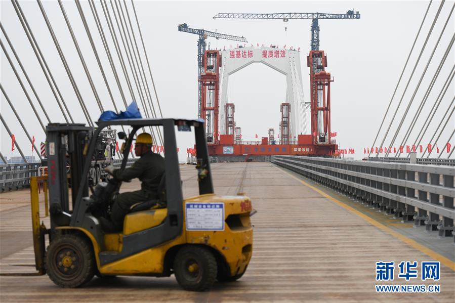 工人在池州長江公路大橋施工現(xiàn)場吊裝最后一塊鋼箱梁(3月29日攝)。 新華社記者曹力攝