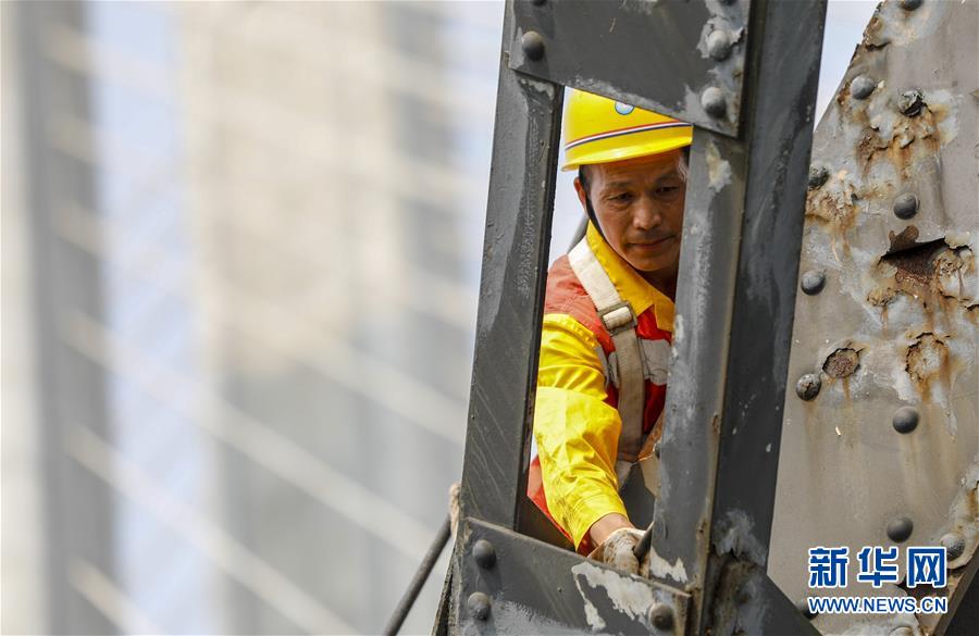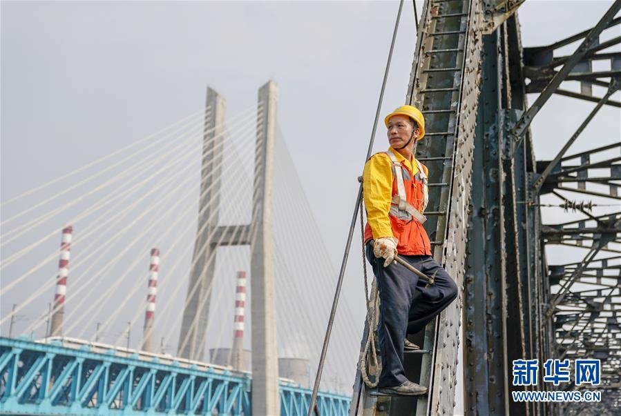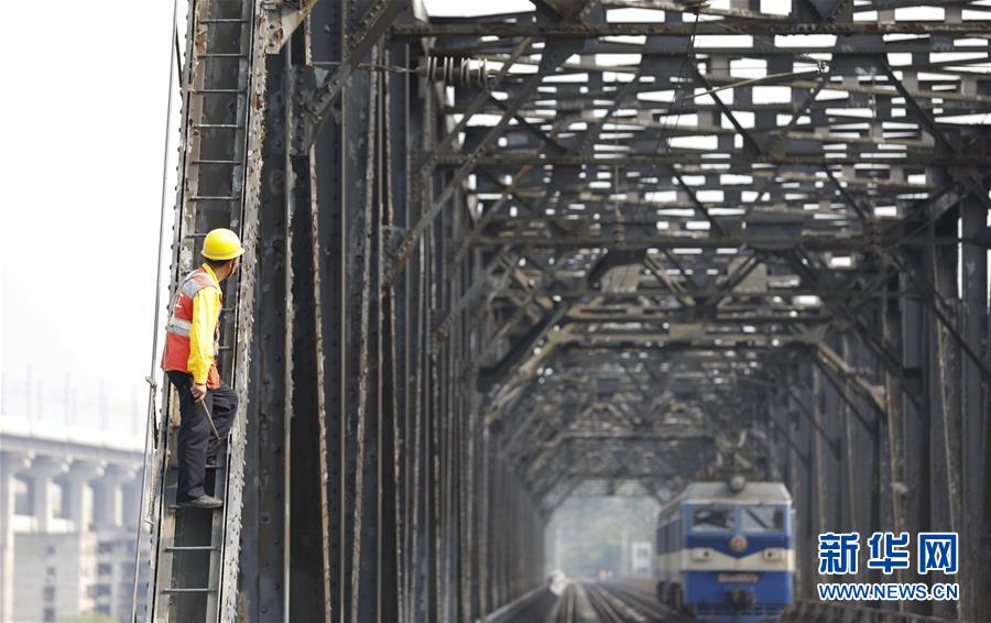中國鐵路成都局有限公司重慶工務(wù)段53歲的橋隧工唐金華在白沙沱長江大橋的鋼架上檢查鋼梁的銹蝕情況(4月23日攝)。 4月23日下午5點40分,隨著重慶白沙沱長江大橋通行的最后一列客運列車順利通過,這座“服役”了59年的重慶首座長江大橋進(jìn)入“退役”倒計時。4月24日后,所有列車將改線經(jīng)距白沙沱長江大橋約100米的新白沙沱長江特大橋通行,新橋“接力”老橋,運輸能力將得到大幅提升。 白沙沱長江大橋于1958年開工,1960年通過首趟列車,是繼武漢長江大橋之后的第二座長江大橋。 新華社記者 劉潺 攝