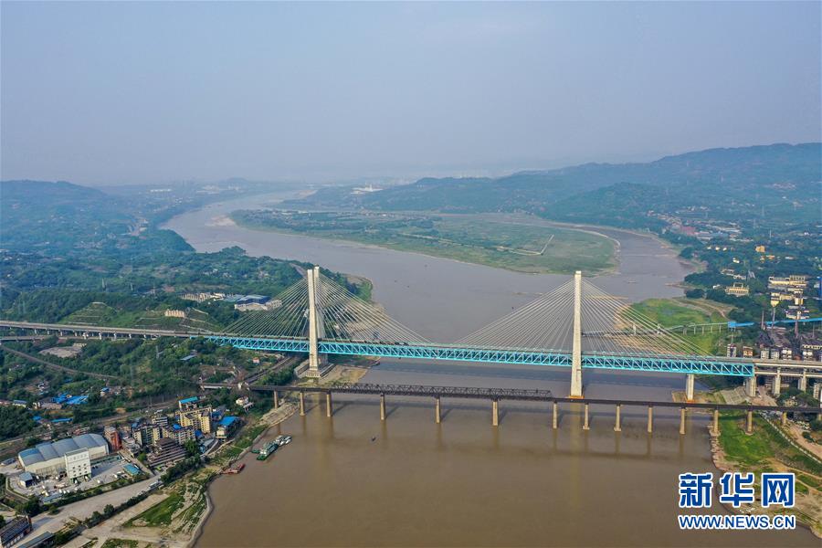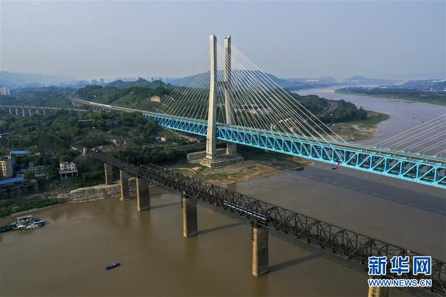 新白沙沱長江特大橋在老橋下游100米左右位置跨越長江,全長約5.3公里,為上下兩層六線鐵路橋,上層為四線鐵路客運專線,2018年1月25日隨著渝貴鐵路通車正式投入運營。該橋是渝貴鐵路全線規(guī)模最大、技術(shù)最為復(fù)雜的控制性工程,是世界上首座六線鐵路鋼桁梁斜拉橋,也是世界上每延米載荷量最大的橋梁,同時也是世界上首座雙層鐵路鋼桁梁斜拉橋。