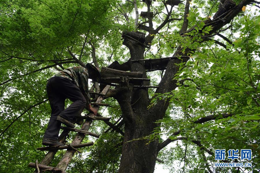 5月10日,在甘肅省隴南市徽縣大河店鎮(zhèn)硬灣村,蜂農(nóng)劉輝林準(zhǔn)備查看放在樹上的蜂箱情況。 甘肅省隴南市徽縣大河店鎮(zhèn)硬灣村位于秦巴山區(qū)深處,2017年,在當(dāng)?shù)卣姆龀窒?,龍崖老巢蜜養(yǎng)殖農(nóng)民專業(yè)合作社成立,蜂農(nóng)們將傳統(tǒng)養(yǎng)蜂技藝和現(xiàn)代加工方式相結(jié)合,并通過電商等渠道打開銷路,有效帶動了當(dāng)?shù)刎毨Т迕衩撠氈赂?。目前整個合作社共有蜂箱2000余個,每箱每年可帶來三四千元的收入。 新華社記者 馬寧 攝