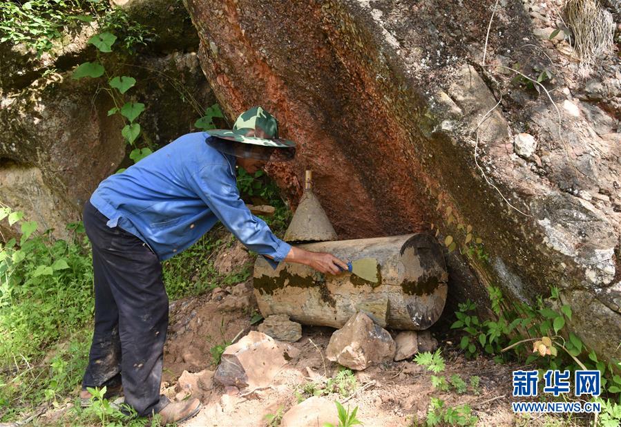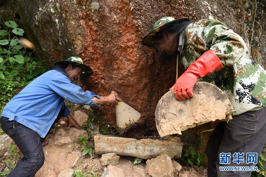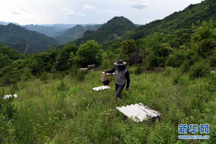 5月10日,在甘肅省隴南市徽縣大河店鎮(zhèn)硬灣村,蜂農(nóng)周仲頤(右)在收蜂。 甘肅省隴南市徽縣大河店鎮(zhèn)硬灣村位于秦巴山區(qū)深處,2017年,在當(dāng)?shù)卣姆龀窒?,龍崖老巢蜜養(yǎng)殖農(nóng)民專業(yè)合作社成立,蜂農(nóng)們將傳統(tǒng)養(yǎng)蜂技藝和現(xiàn)代加工方式相結(jié)合,并通過電商等渠道打開銷路,有效帶動了當(dāng)?shù)刎毨Т迕衩撠氈赂?。目前整個合作社共有蜂箱2000余個,每箱每年可帶來三四千元的收入。 新華社記者 馬寧 攝