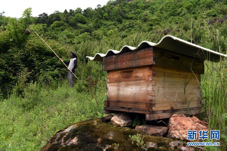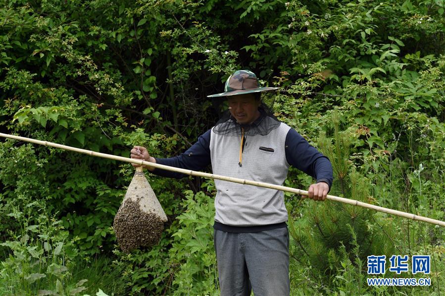 5月10日,在甘肅省隴南市徽縣大河店鎮(zhèn)硬灣村,蜂農(nóng)周仲頤在收蜂。 甘肅省隴南市徽縣大河店鎮(zhèn)硬灣村位于秦巴山區(qū)深處,2017年,在當(dāng)?shù)卣姆龀窒?,龍崖老巢蜜養(yǎng)殖農(nóng)民專業(yè)合作社成立,蜂農(nóng)們將傳統(tǒng)養(yǎng)蜂技藝和現(xiàn)代加工方式相結(jié)合,并通過電商等渠道打開銷路,有效帶動了當(dāng)?shù)刎毨Т迕衩撠氈赂?。目前整個合作社共有蜂箱2000余個,每箱每年可帶來三四千元的收入。 新華社記者 馬寧 攝