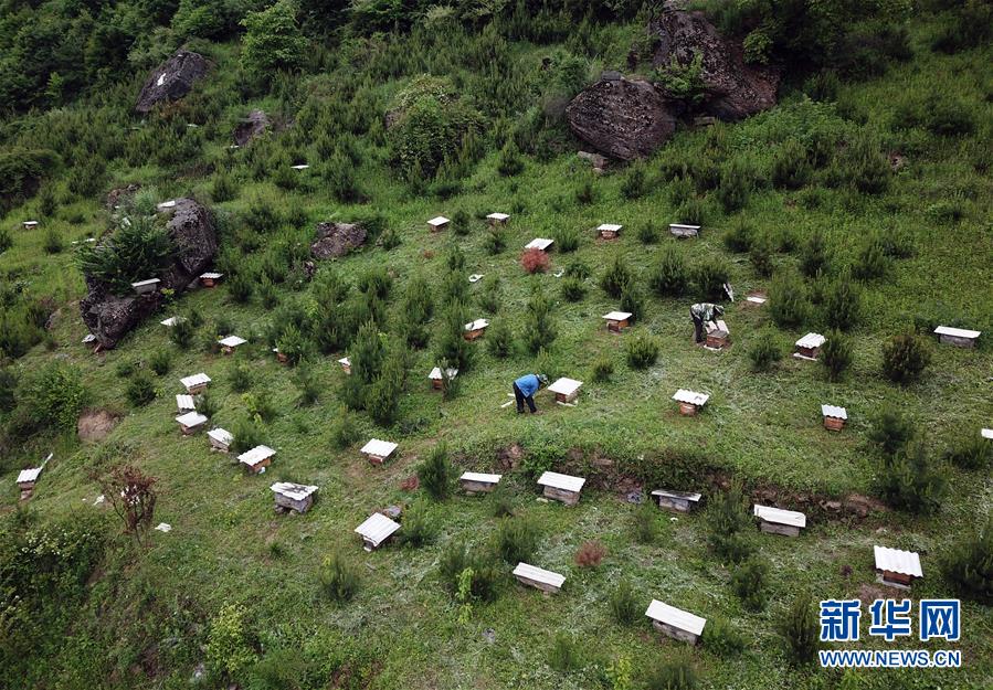 5月10日,在甘肅省隴南市徽縣大河店鎮(zhèn)硬灣村,蜂農(nóng)查看蜂箱情況(無人機拍攝)。 甘肅省隴南市徽縣大河店鎮(zhèn)硬灣村位于秦巴山區(qū)深處,2017年,在當(dāng)?shù)卣姆龀窒?,龍崖老巢蜜養(yǎng)殖農(nóng)民專業(yè)合作社成立,蜂農(nóng)們將傳統(tǒng)養(yǎng)蜂技藝和現(xiàn)代加工方式相結(jié)合,并通過電商等渠道打開銷路,有效帶動了當(dāng)?shù)刎毨Т迕衩撠氈赂?。目前整個合作社共有蜂箱2000余個,每箱每年可帶來三四千元的收入。 新華社記者 馬寧 攝