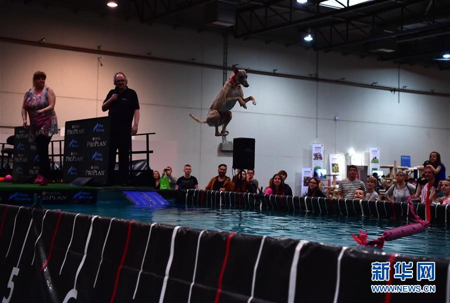 5月19日,在德國多特蒙德舉行的寵物展上,一只獵犬參加跳水比賽。 為期三天的德國多特蒙德“狗和貓”寵物展19日落幕。寵物展期間,人們帶著自己的“萌寵”來到會(huì)場,參與寵物跳水、舞蹈、選美等趣味比賽,并與其他寵物愛好者及展商交流互動(dòng)。 新華社記者逯陽攝
