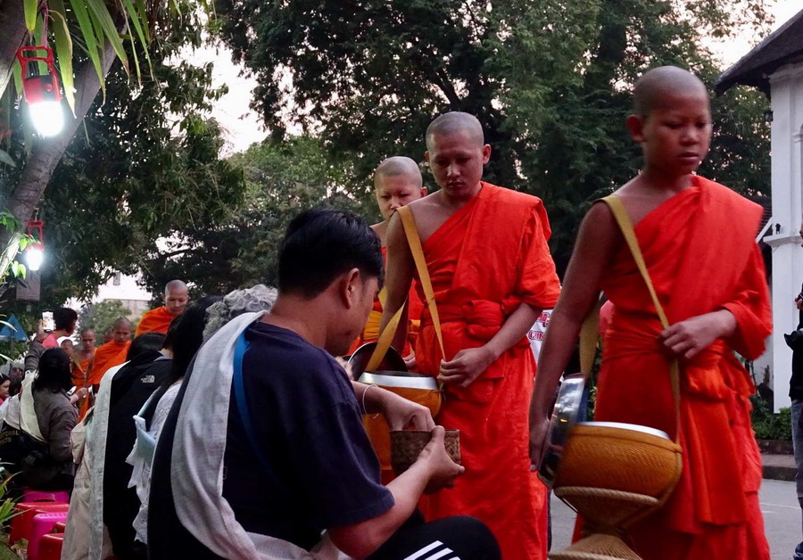 隨著旅游業(yè)的發(fā)展,現(xiàn)在游客們也都參與到布施活動(dòng)中。僧侶們一直保持著依靠清晨化緣得來的食物充饑的習(xí)俗,多余的食物會(huì)用于慈善活動(dòng)。李仁奇 攝