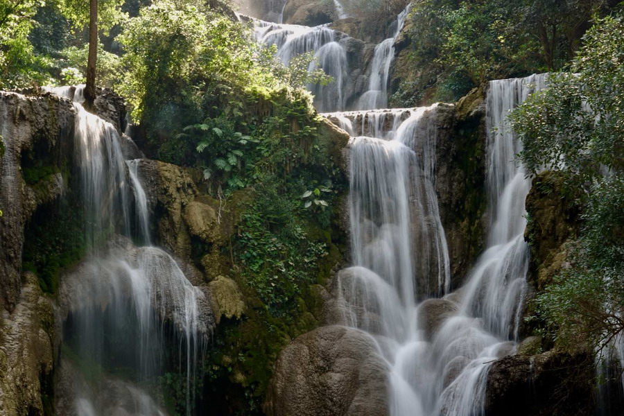 光西瀑布是一個(gè)瀑布群,位于瑯勃拉邦以南30多公里的原始森林中,其中一處高40多米,雖然水量不大,但有一種天然的涓細(xì)之美,不同凡響。