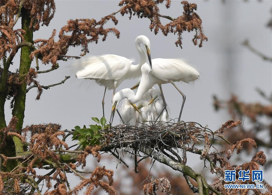 在江西省南昌市新建區(qū)象山森林公園內(nèi),白鷺和自己的雛鳥在一起(5月21日攝)。 近日,在江西省南昌市新建區(qū)象山森林公園內(nèi),已安家筑巢的大批鷺鳥陸續(xù)孵化出了后代。象山森林公園有著“鷺鳥王國”的美譽,生態(tài)環(huán)境良好,每年都會吸引白鷺、蒼鷺、夜鷺等種類的鷺鳥飛抵棲息和繁衍后代。 新華社記者 彭昭之 攝