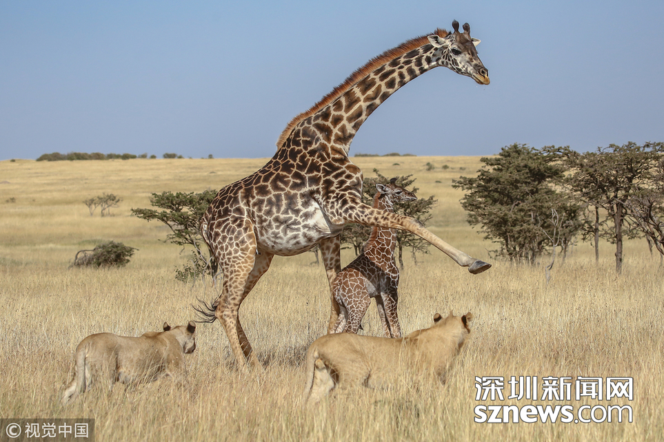 深圳新聞網(wǎng)訊 當?shù)貢r間2018年8月15日,肯尼亞馬賽馬拉,當?shù)貙в握材匪埂ぜ{帕索(James Nampaso)拍攝到一群獅子圍攻母長頸鹿和她的幼崽。盡管長頸鹿勇敢地抵抗獅群的進攻,但當一頭母獅跳上它的脊背時,它被分散了注意力,使得獅群最終捕獲了它的孩子。