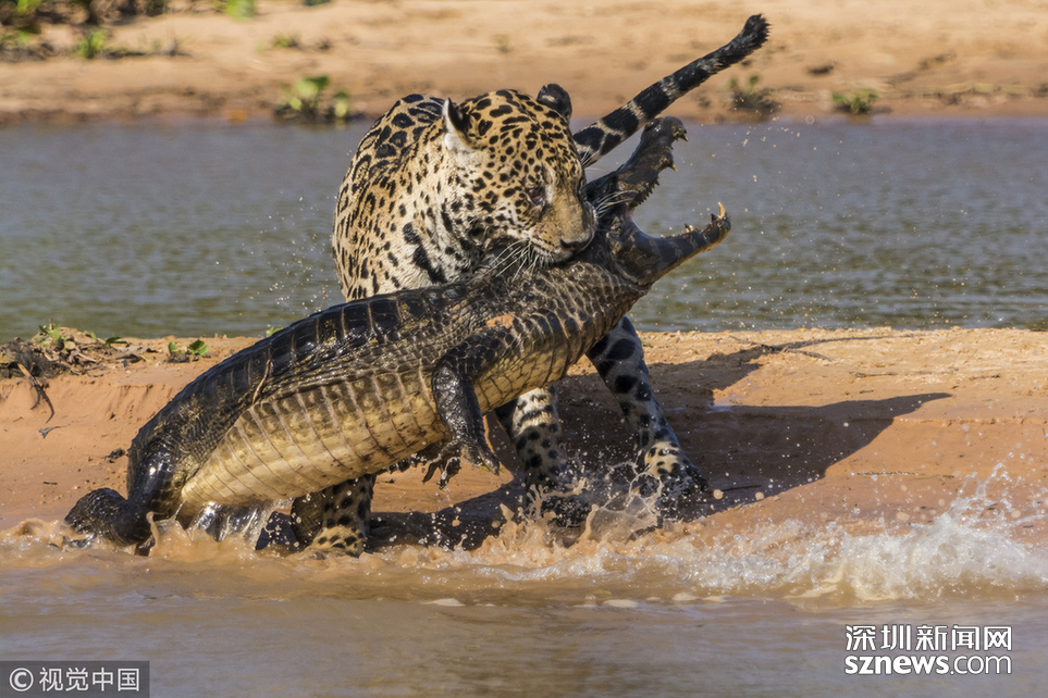 當(dāng)?shù)貢r間2013年8月25日,巴西潘特納爾,一頭雄性美洲豹攻擊了一條巴拉圭凱門鱷并與之纏斗。這只美洲豹預(yù)先躲在水中匍匐前進(jìn),然后突然出現(xiàn)把這只鱷魚震住,隨后用牙刺進(jìn)鱷魚的堅硬的外殼中,將其拖入?yún)擦帧?/p>