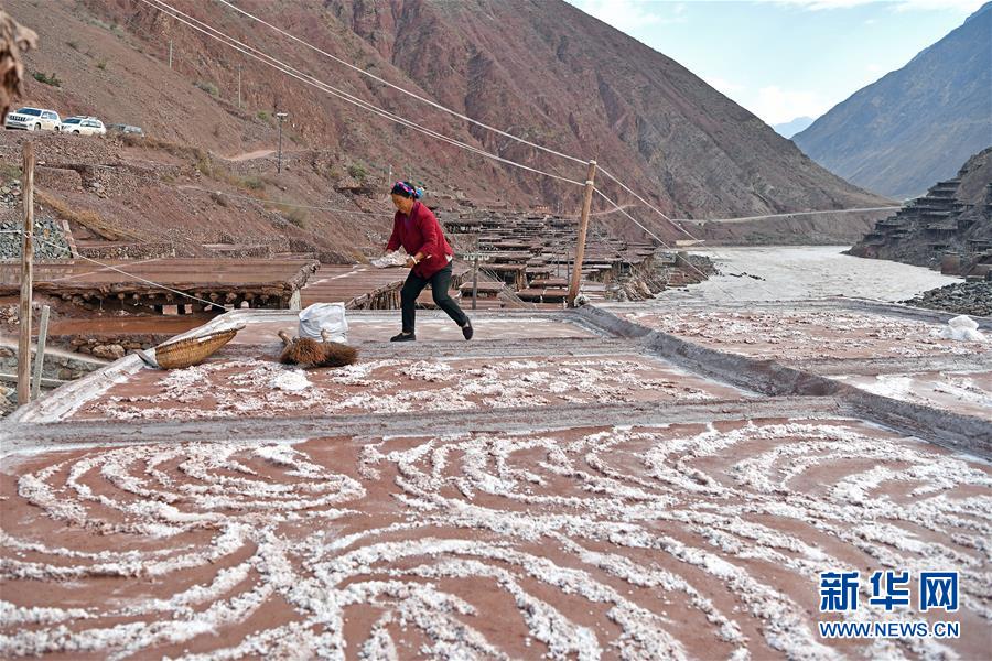 5月22日,西藏納西民族鄉(xiāng)加達村村民拉措在鹽田上收鹽。位于西藏昌都芒康縣瀾滄江畔的古鹽田,至今仍保持最原始的手工曬鹽方式。據(jù)史料記載,唐朝時期當?shù)鼐烷_始曬鹽。鹽田在瀾滄江兩岸依山而建,由多根木柱搭架,架上用透水性強的泥土鋪成平面夯實,當?shù)鼐用駨臑憸娼系柠}井、鹽池中取出鹵水倒入鹽田,經(jīng)陽光蒸曬、風干,結(jié)晶成鹽。遠遠望去,鹽田錯落有致,田中鹵水宛若鏡面,形成壯麗奇觀。新華社記者李鑫 攝