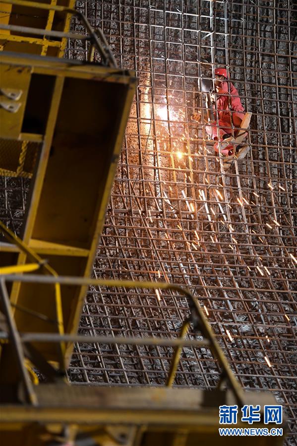 5月31日,一名工人在烏東德水電站的泄洪洞中施工。 新華社記者陳曄華攝