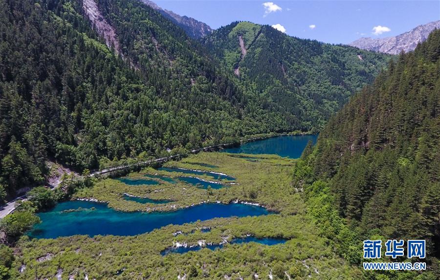 這是九寨溝景區(qū)內(nèi)一景(6月5日無人機(jī)拍攝)。新華社記者薛玉斌攝