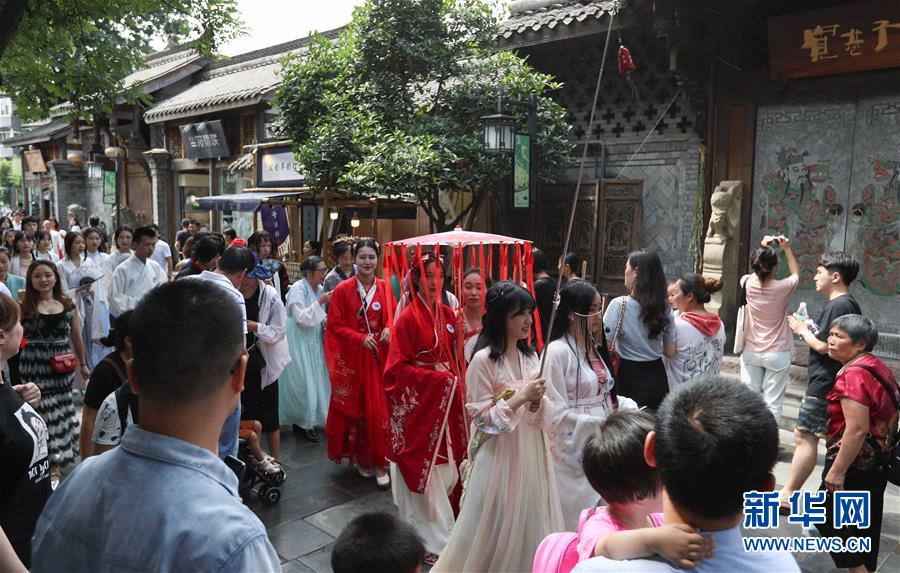 6月9日,漢服愛好者在成都寬窄巷子巡游,宣傳“聞香識寬窄”主題活動。新華社記者 江宏景 攝