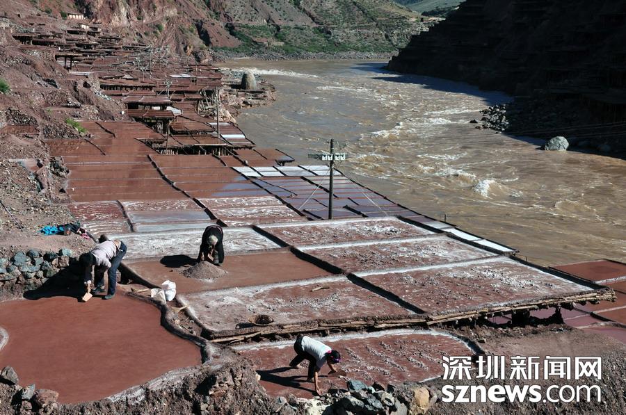 西藏芒康縣納西民族鄉(xiāng)加達村村民在鹽田曬鹽(6月4日攝)。新華社記者晉美多吉攝